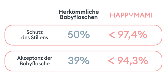 • Bei Verwendung von Happymami mit der Form ihrer einzigartigen Brust setzen 97,4 % der Babys ihr Stillen fort
